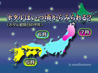 各地の気象台の観測によると、沖縄で観測されるのは5月半ばです。その後見られる範囲は徐々に北へと広がり、5月末には大阪でも見られるようになります。東京近辺では6月中旬に、そして6月末には一気に東北南部、7月になると東北北部でホタルのほのかな光を楽しめるようになるのです。